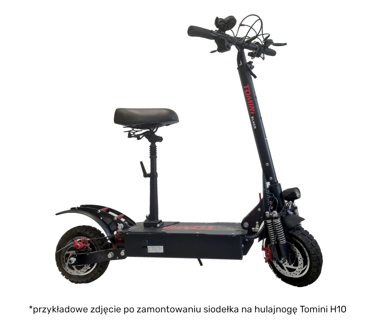 Siodełko jest przygotowane do łatwego i szybkiego montażu na hulajnodze Tomini H10 i można je złożyć wraz z kolumną kierownicy.